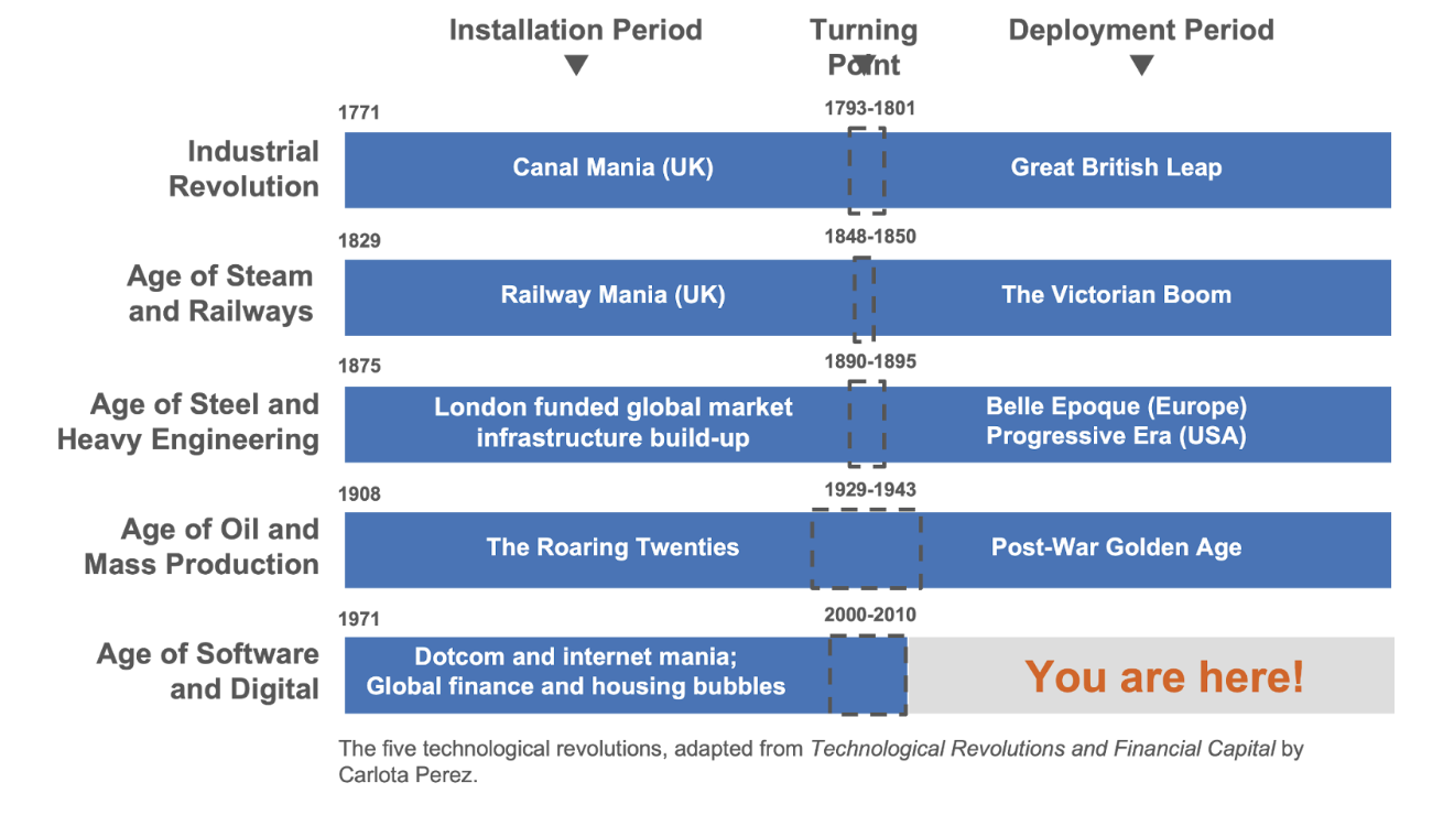 It started with the Industrial Revolution in the 1770s, followed by the Age of Steam and Railways in the early 19th century, then the Age of Steel and Heavy Engineering in the late 19th century, bringing us to the Age of Oil and Mass Production in the 20th century. We conclude with the current Age of Software and Digital into the 21st century.