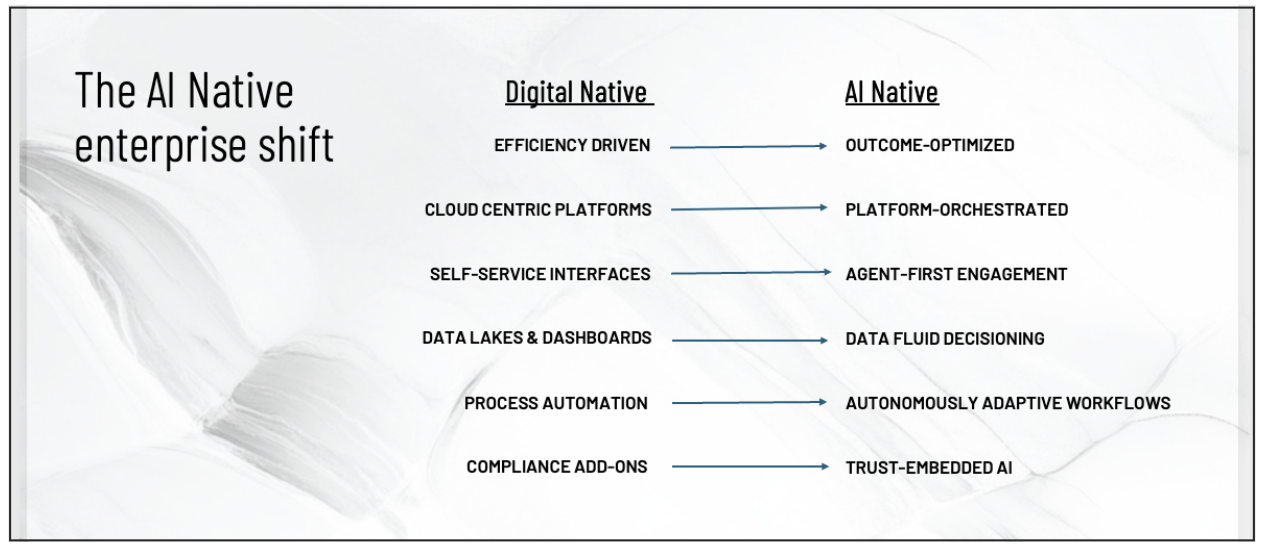 Digital-first companies still operate in a deterministic model, making decisions based on historical data and predefined logic that delivers the same outcome, for every customer, every time. AI-native enterprises function differently. Real-time intelligence drives every action, outcomes vary based on context, and individualization and immediacy define the customer experience.